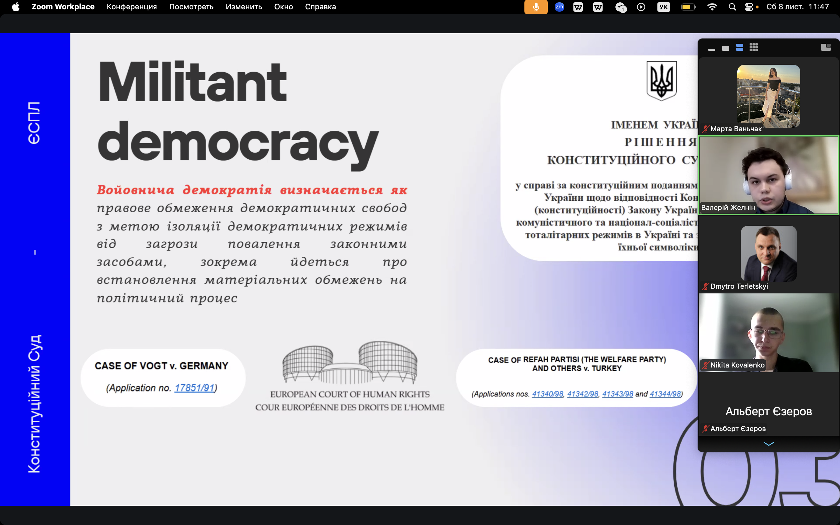 Поліщук Дар’я Володимирівна, студентка 4-го курсу Навчально-наукового інституту права Сумського державного університету, з доповіддю «Гарантії прав дітей та сім’ї в умовах війни: конституційно-правовий аспект».